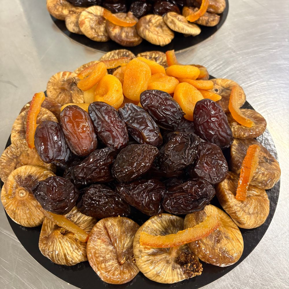 Plateau de fruits sec composé de figues , dattes , abricots , pruneaux , orangettes